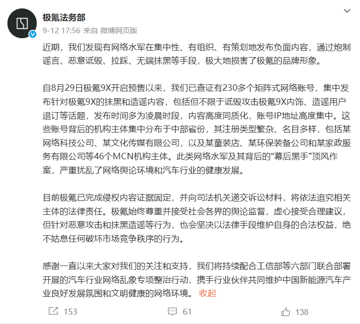 在国家出手后,车企们也快速跟进,极氪、蔚来、小鹏、岚图等多家车企相继发文披露水军信息和维权进展。其中,极氪表示针对极氪9X的抹黑攻击和造谣内容,已经固定证据,并向司法机关递交诉讼材料,将依法追究相关主体的法律责任。另外,蔚来也公布了对于维权起诉的判决结果,算是给了网络“黑手”一些震慑。