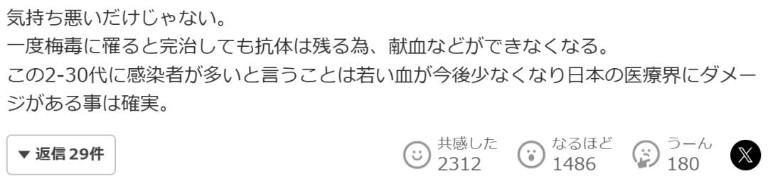 “不仅仅是让人恶心的问题了...一旦感染梅毒,即使痊愈后抗体仍会残留,会导致出现无法献血等情况。