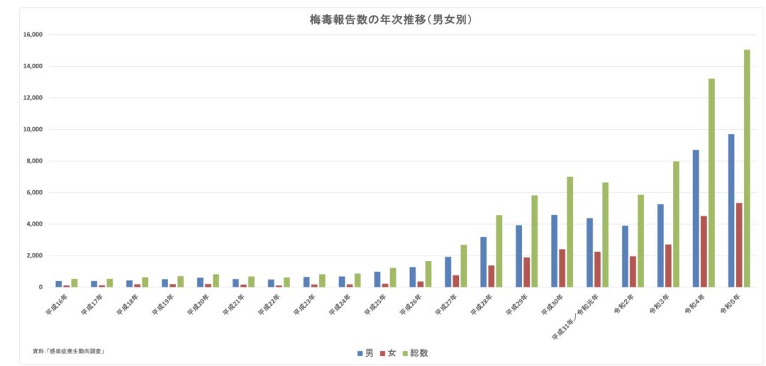 据厚生劳动省统计,梅毒感染者数量在2020年达到6619人,到了2022年首次突破1万大关。