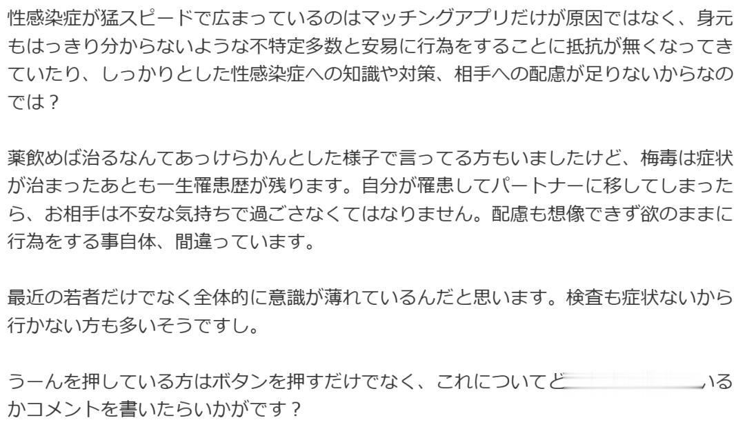 “性传播疾病之所以以惊人速度蔓延,并非仅因交友软件之故,更在于人们对与身份不明的陌生人轻易发生关系已不再抗拒,且缺乏扎实的性病防治知识、防护意识及对伴侣的关怀。