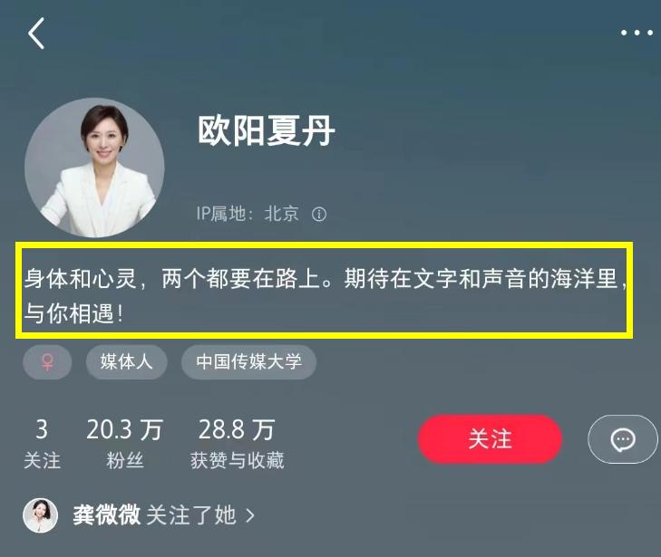 仔细看欧阳夏丹开设了多个自媒体账号,她对自己的标签依然是“主持人”“媒体人”,如今也斩获了上百万粉丝,虽和网红大咖无法相提并论,但对于2023年1月份才入驻而言,显然已算不错。虽然顶着“前新闻联播主持人”的头衔,但欧阳夏丹并非畅通无阻,甚至还屡屡被冷落,让人直呼心疼。