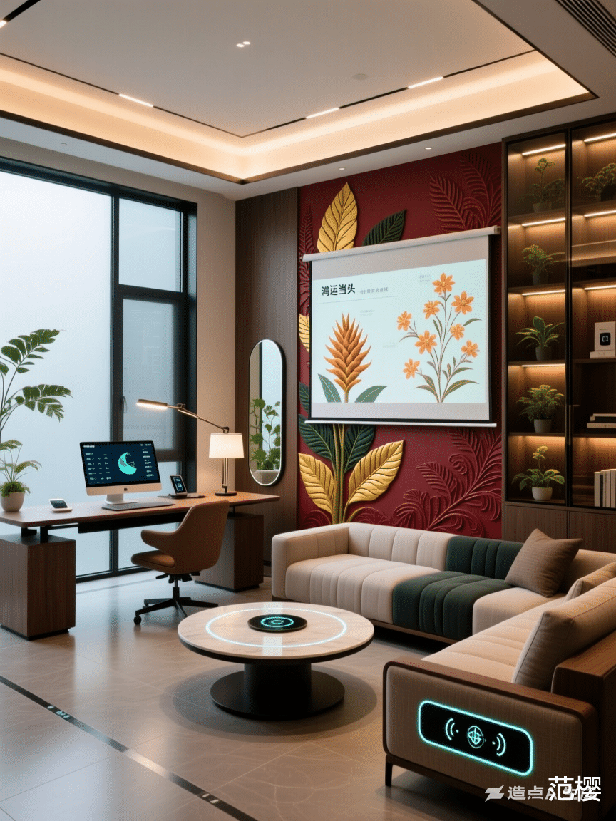 书房会客厅,有书房和会客二合一功能,杭派花卉室内设计风格,智能设备和凤梨科果子属花卉图案和植物,栖红色和朽叶色和祖母绿叶和茄皮色和棕色等相配色。杭派雅韵·智卉新居——全屋空间设计概念方案