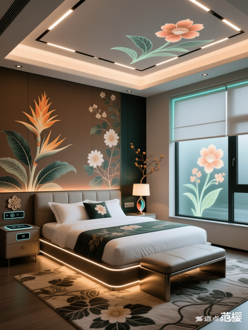 卧室 ,杭派花卉室内设计风格,智能设备和凤梨科果子属花卉图案和植物,萱草色和莺茶色和祖母绿和玉白色和棕色相配色。