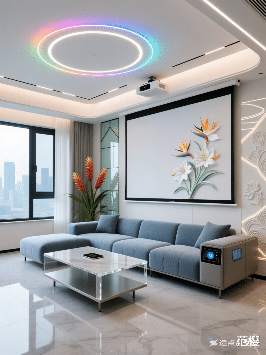 客厅,杭派花卉室内设计风格,智能设备和凤梨科果子属花卉图案和植物,客厅以玉子色景泰蓝色玉白色白绿色勿忘草色相搭配。