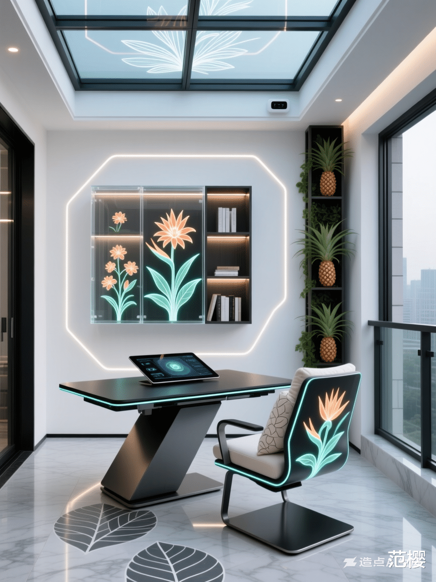 阳台,杭派花卉室内设计风格,智能设备和凤梨科果子属花卉图案和植物水果,朽叶色和钛铁黑色和白绿色等相配色。