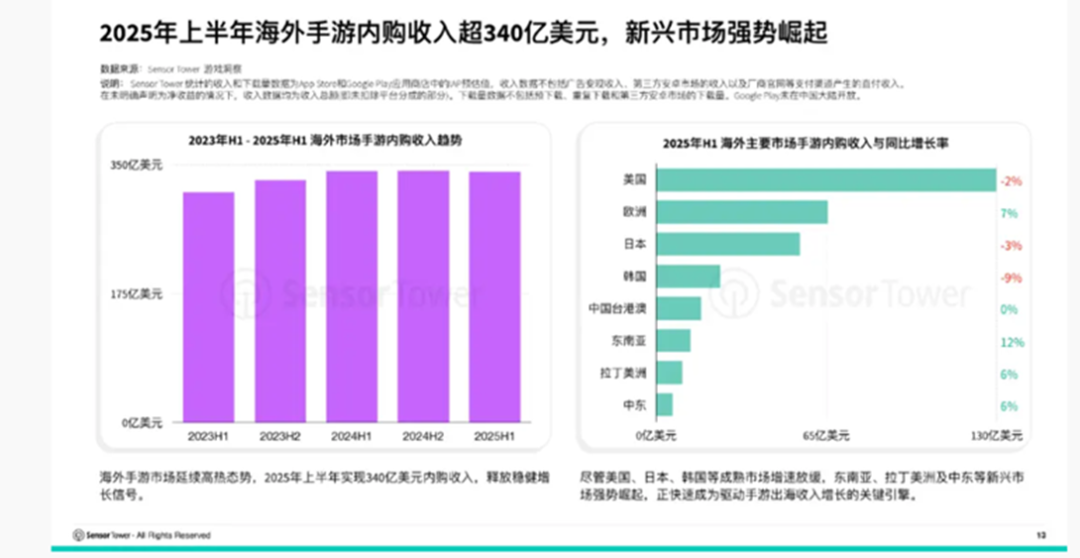 根据中国音数协游戏工委发布的《2024年1-6月中国游戏产业报告》,2025年上半年,中国自研游戏的海外实际销售收入达到95.01亿美元,同比增长超过11%。这一增速重新回到了2021年出海高峰期水平,中国游戏企业在国际竞争中依然具备强劲的动能。正在全球更大范围内获得认可,逐渐从“走出去”迈向“走进去”。据SensorTower数据显示,2025上半年传统出海市场存量状态加剧,中东、拉美、东南亚等新兴市场仍然在崛起,从这里,厂商或许能找到更多的增量机会。