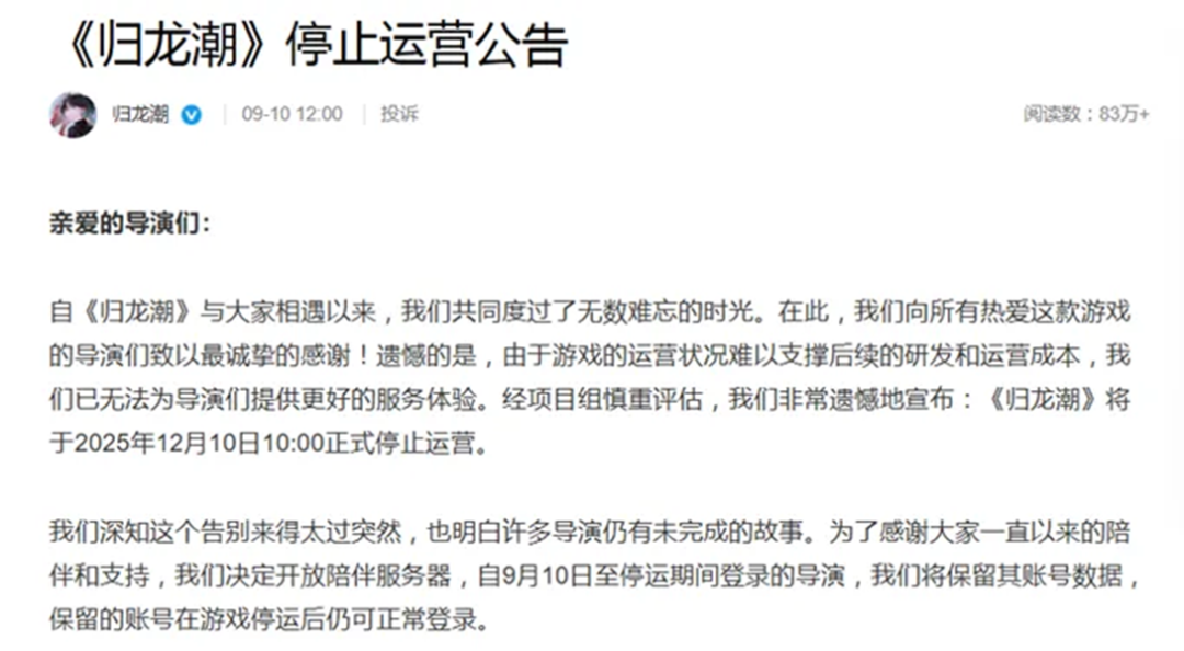 FunPlus旗下龙潮阁工作室推出的首款游戏《归龙潮》发布停服公告,宣布将于12月10日正式终止运营。游戏曾收获了极高的关注,预约量超过了1000万,但公测后表现并不尽如人意,上线3个月后就因“永久月卡”而引发了争议,最终在一周年庆典(9月13日)前夕黯然退场。