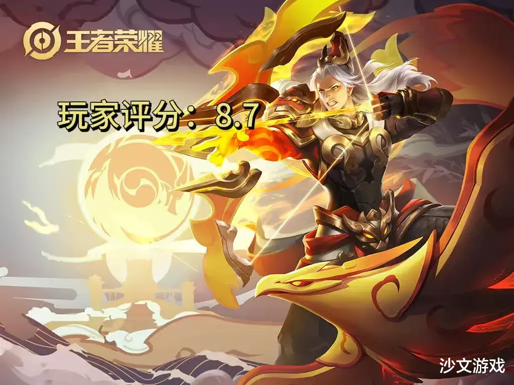 第二款,辉光之辰,玩家评分8.7。这是后羿的狗年限定皮肤,外观以古代神话人物为原型,手中的弓箭时刻散发着火焰,既符合审美又非常霸气。局内特效,一技能射出时有火焰和祥云特效,3技能为一只全身散发火焰的雕。整体技能设计可以说是后羿最用心也是视觉效果最好的一款,不过打击感略差一些。
