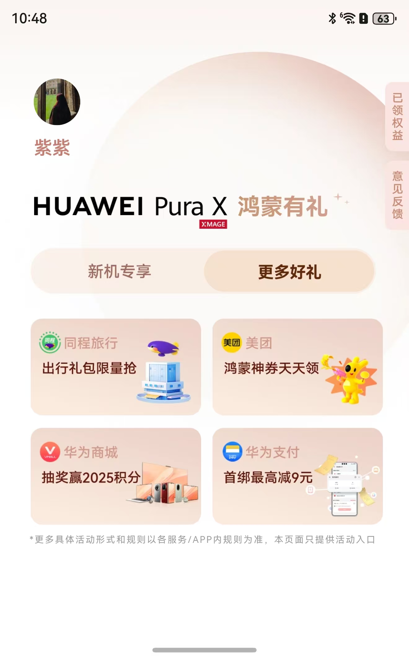 除此之外,华为还联合同程旅行、美团推出限量出行礼包和“鸿蒙神券”,更有华为商城抽奖赢2025积分,华为支付首次绑卡支付立减9元等好礼。如果你本来就打算买台华为Prua X,这些权益叠加起来相当于省了1200多,可以说很划算了。而且这些权益涉及的应用,都针对华为Pura X进行了深度适配,使用体验也是更上一层楼。