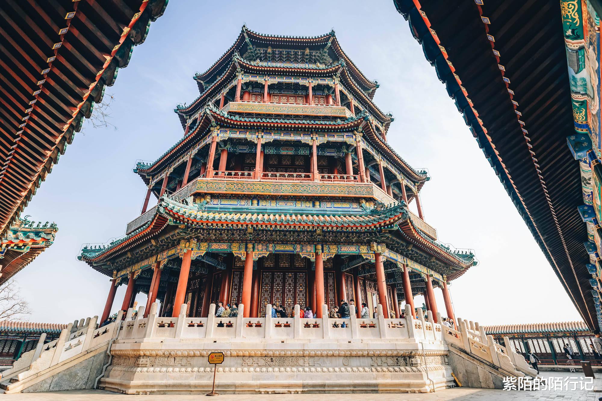 早春时光,中午的太阳已是暖洋洋的了。登上颐和园最高的万寿山,在山顶的佛香阁前举目遥望,整个颐和园都尽收眼底。