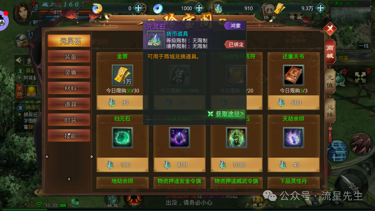 兑换商店:部分NPC商店或兑换系统可能会提供元灵石的兑换选项,玩家可以使用游戏中的货币或特定道具来兑换元灵石。