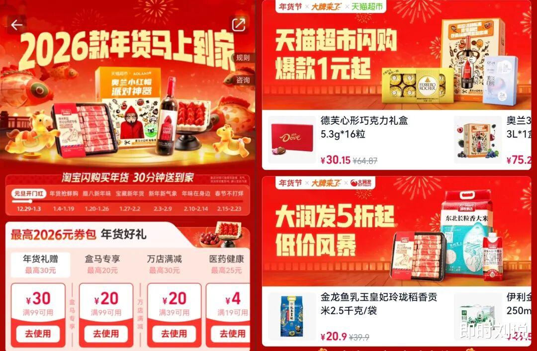 淘宝闪购近日正式启动2026年货节,以“淘宝闪购买年货,30分钟送到家”为核心主张,围绕团聚、出行、礼赠、装扮玩乐四大高频场景推出年货购物解决方案。据悉,随着年轻用户成为消费主力,年货采购正从过往以家庭为单位的“集中囤货”,转向更个人化、场景化的“即时满足”。基于这一洞察,淘宝闪购年货节于12月底提前开启,通过整合盒马鲜生、天猫超市的优质商品供给,并联合大润发、沃尔玛等大型连锁商超,百果园、酒小二、吉列等知名品牌,共同推出多款新年节日爆款及冬季时令大单品。智利车厘子、红颜草莓礼盒、鲜活波士顿龙虾、澳洲和牛肥牛卷、榴莲千层等品质食材,以及“马上有钱”银柳福桶、新年玫瑰花束等节庆好物悉数上线,覆盖送礼、聚会、节日布置等多元场景,消费者30分钟即可一站式购齐所需年货。