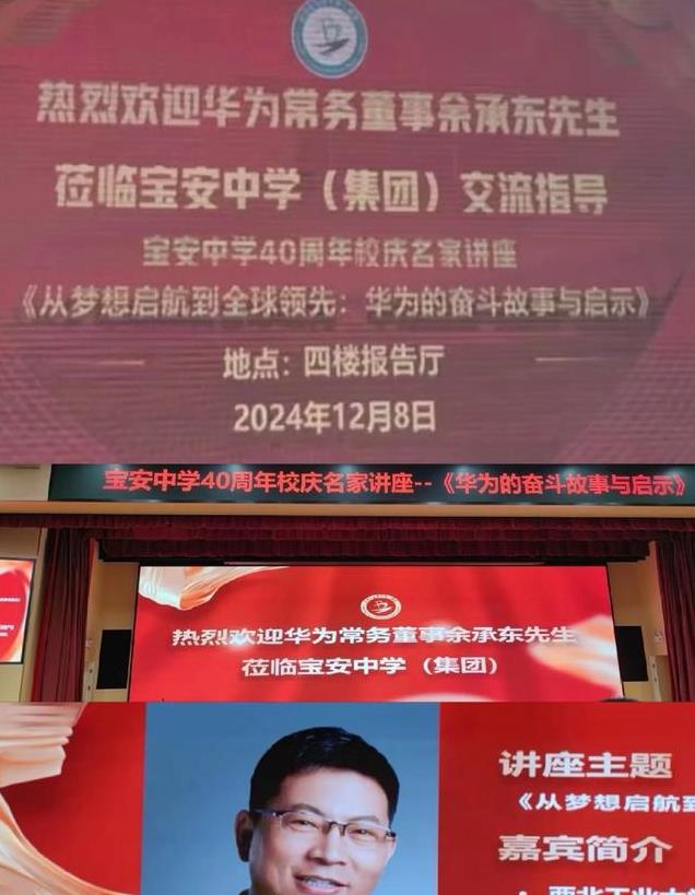 昨天晚上,有网友分享了华为余承东出席了深圳宝安中学的40周校庆名家讲座,并上台发言,其演讲主体为从梦想启航到全球领先:华为的奋斗故事与启示!