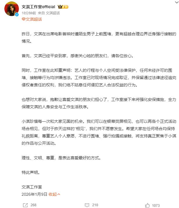 昨日,文淇在出席电影首映时遭陌生男子上前围堵,更有超越合理边界近身强行接触的情况。首先,文淇已经平安到家,感谢关心她的朋友们,请各位放心。同时,工作室在此郑重声明:艺人的行程与个人空间受法律保护,任何未经许可的围堵、接触等行为均涉嫌违法。工作室已对现场情况完成取证,并保留通过法律途径追究侵权者责任的权利,我们绝不姑息任何侵犯艺人合法权益的行为。也想对大家说,抱歉让喜爱文淇的朋友们担心了,工作室接下来将强化安保措施,全力保障文淇的人身安全与工作生活秩序。小淇珍惜每一次和大家见面的机会。我们可以在银幕荧屏相见,也可以在各个正式活动场合相见,但对于昨天这样的“相见”,我们并不愿意发生。希望大家在任何场合均保持礼貌距离,尊重艺人个人意愿,不进行围堵、强行拍摄或接触,将支持真正聚焦于小淇的作品与公开活动。理性、文明、尊重,是表达喜爱最好的方式。特此声明。