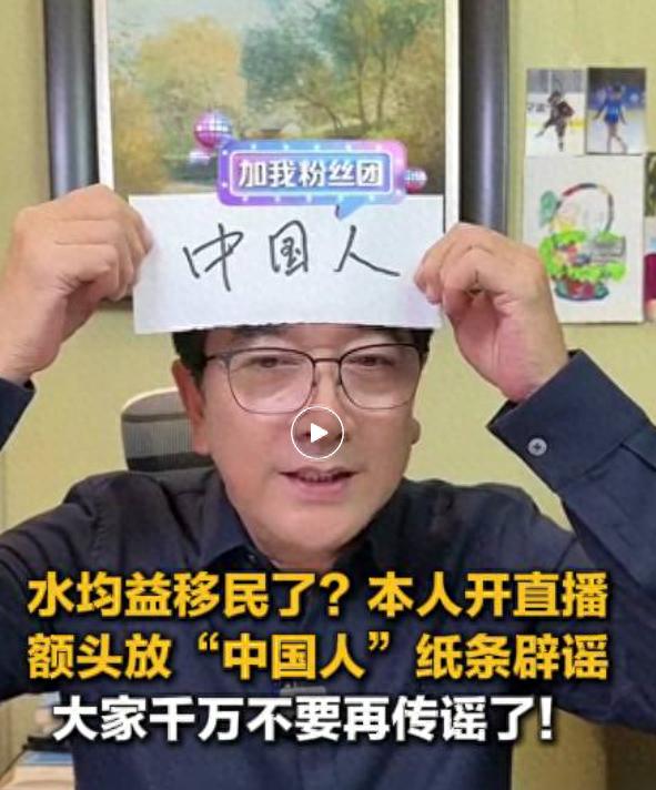 据@上游新闻,10月24日,前央视主持人水均益开直播时,额头放“中国人”纸条否认移民传闻,请大家千万不要再传谣了。