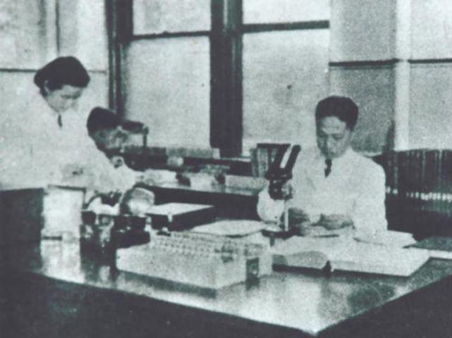 陈世骧与助手龚韵清在研究美机投下的昆虫