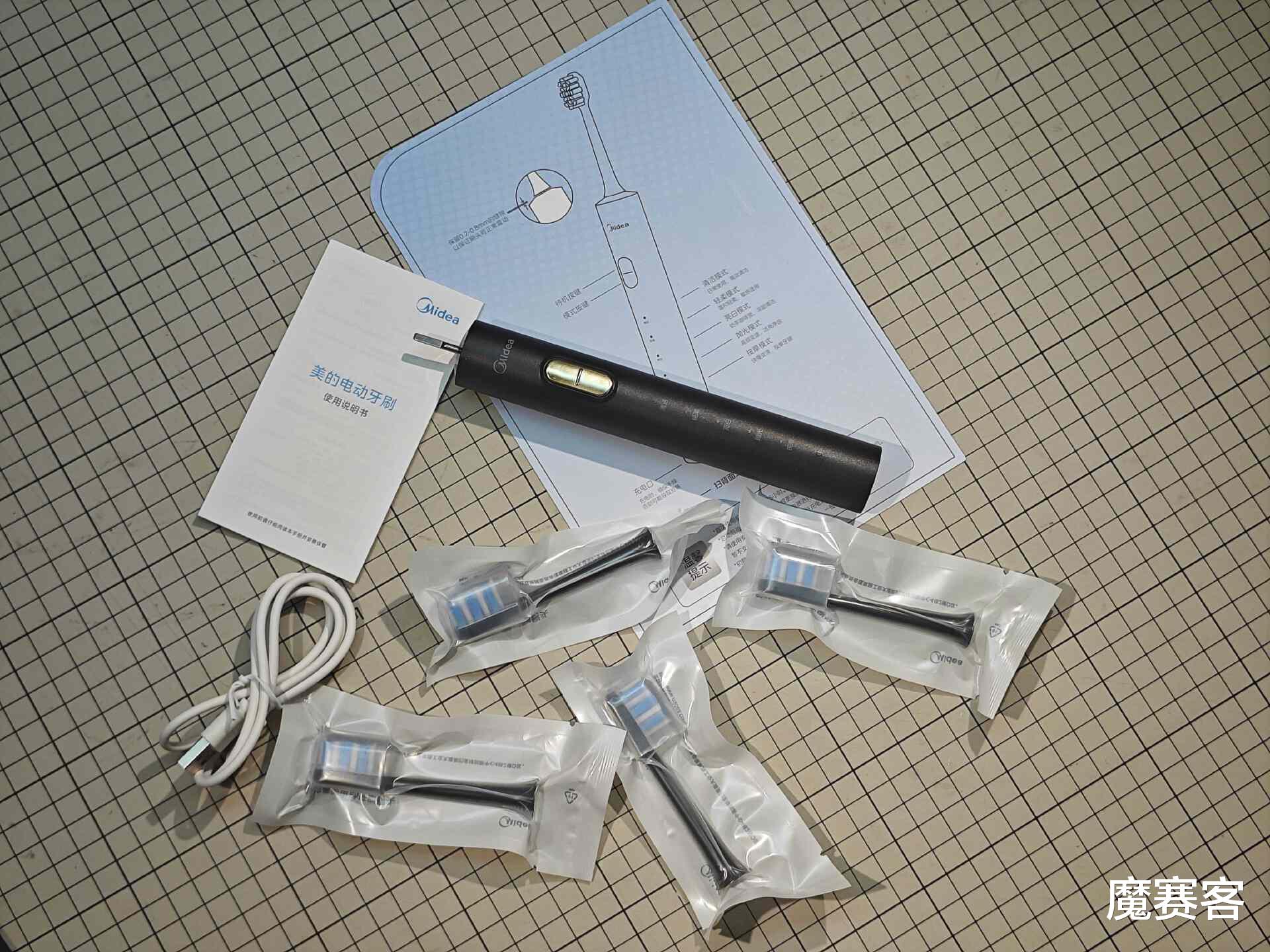 ▲打开后可以看到牙刷机身本体、刷头4个、说明书以及C口充电线。