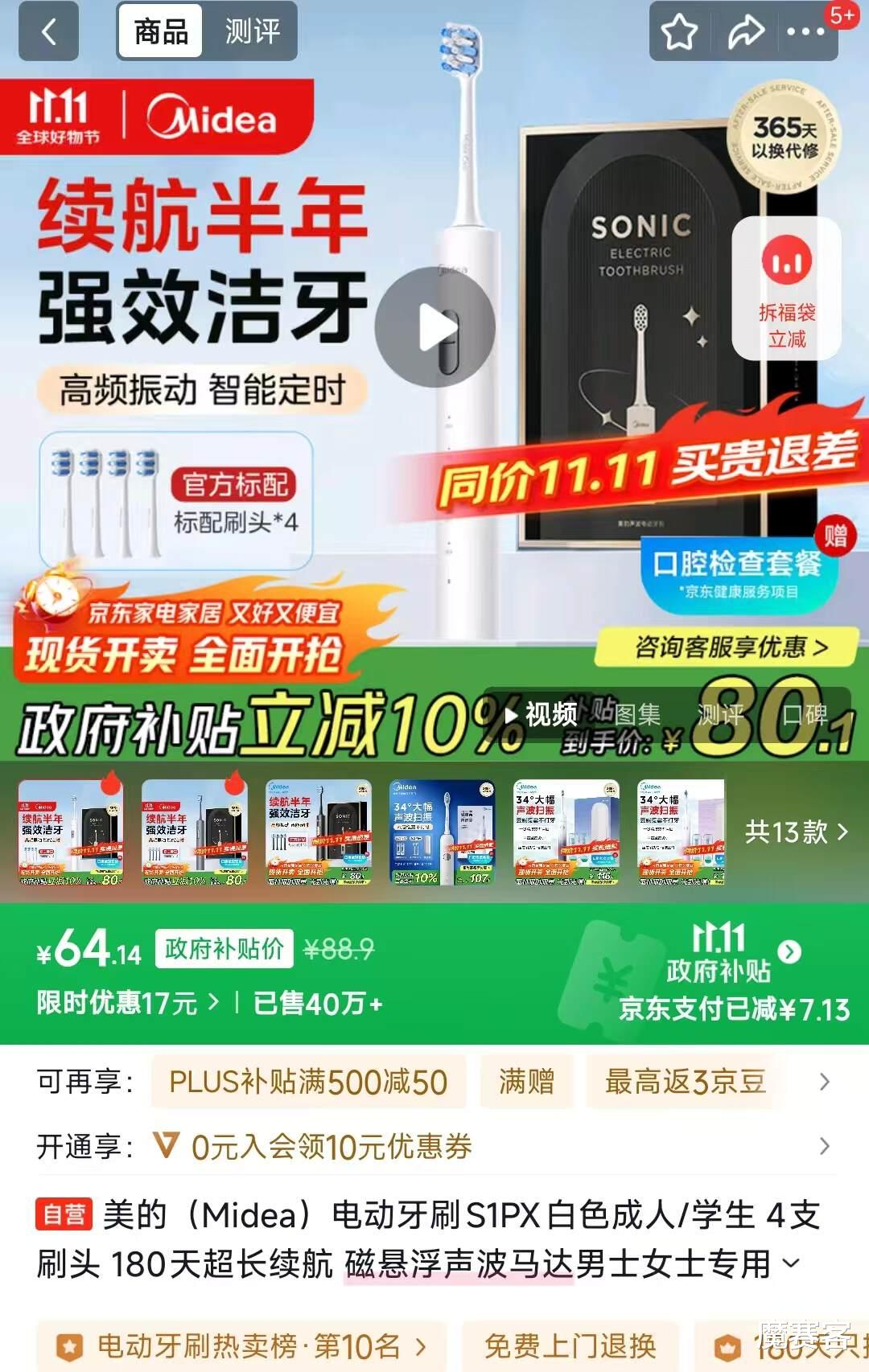 这次和大家分享的是大妈家提供的美的电动牙刷,它便是声波震动式的,目前某东优惠通过国补最低可以做到六十多。