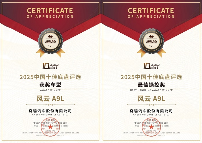 2025年9月9日,历时5个月之久的中国十佳底盘评选终于公布结果,而风云A9L凭借卓越的底盘技术和操控性能在该项目主客观测试中脱颖而出,一举拿下“2025年中国十佳底盘”综合奖与“最佳操控奖”单项奖。