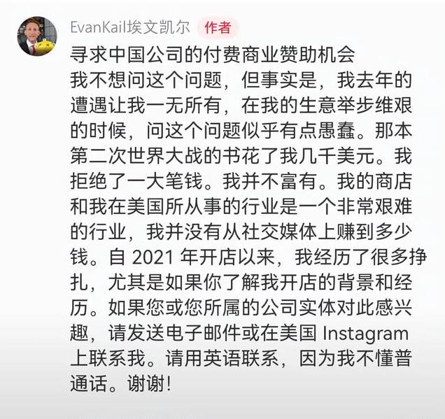埃文凯尔曾经在个人账号留言,他说自己最近几年生意不景气,很需要钱。