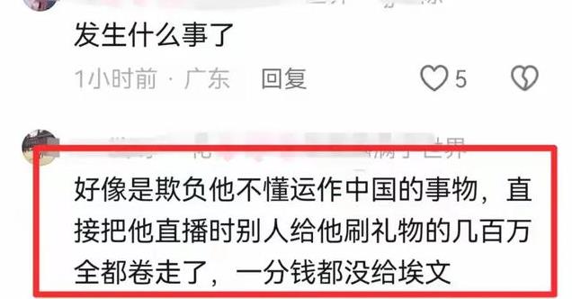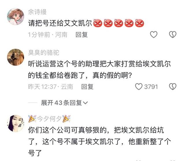 有网友猜测可能是埃文凯尔原账号的运营团队,将网友们刷给埃文凯尔的礼物钱都卷跑了。