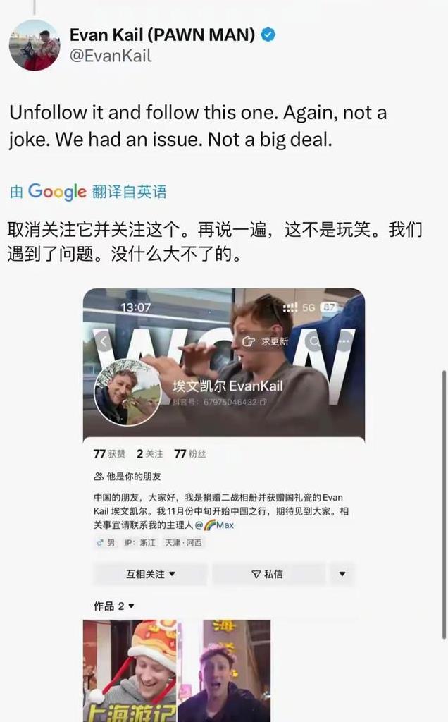 埃文凯尔还在其外网账号发布动态,强调新账号是他本人的唯一账号。他说自己遇到了问题。让粉丝们取消关注老账号,关注新账号。