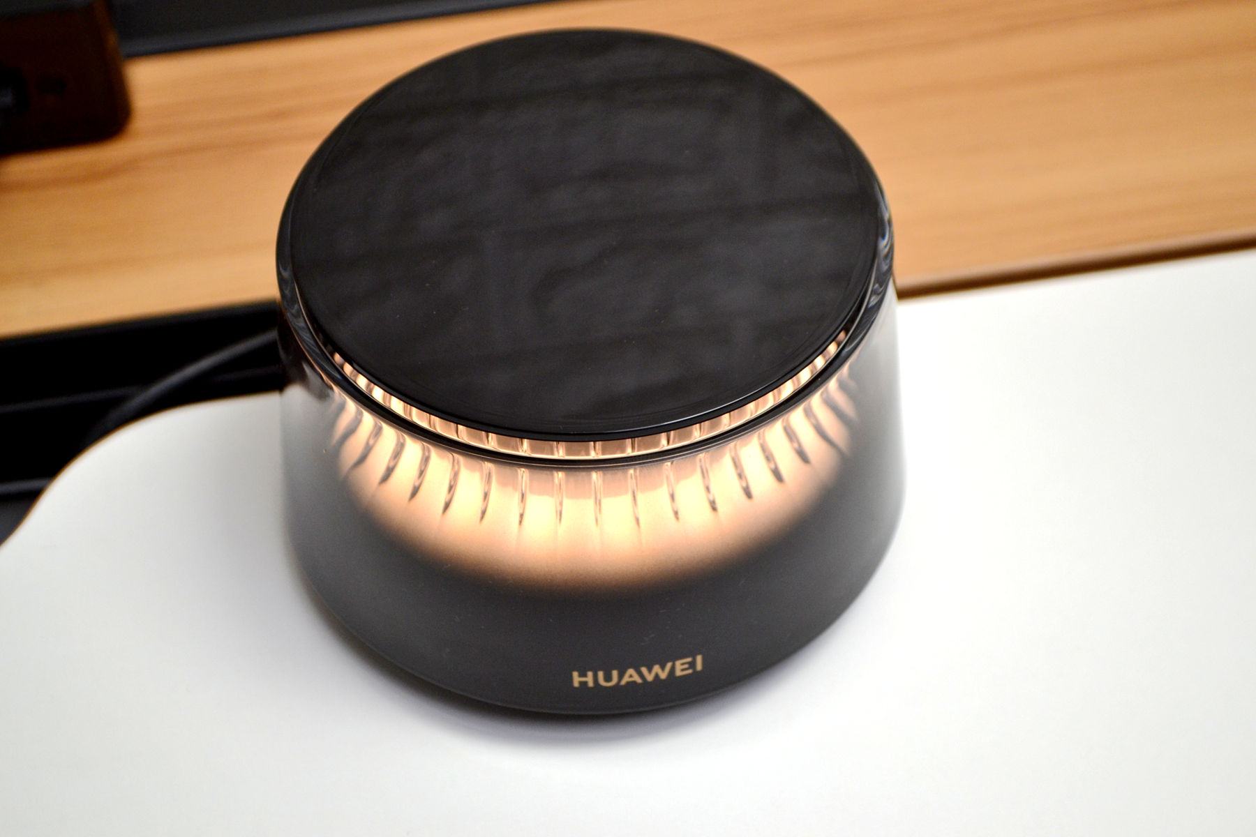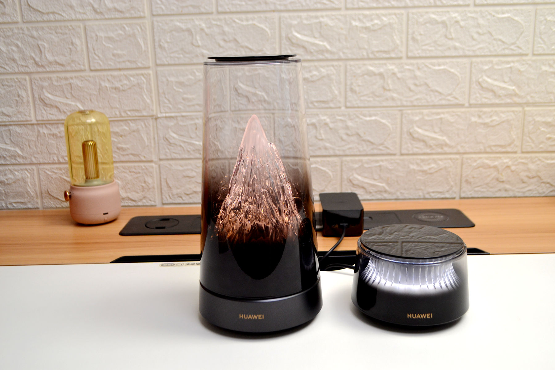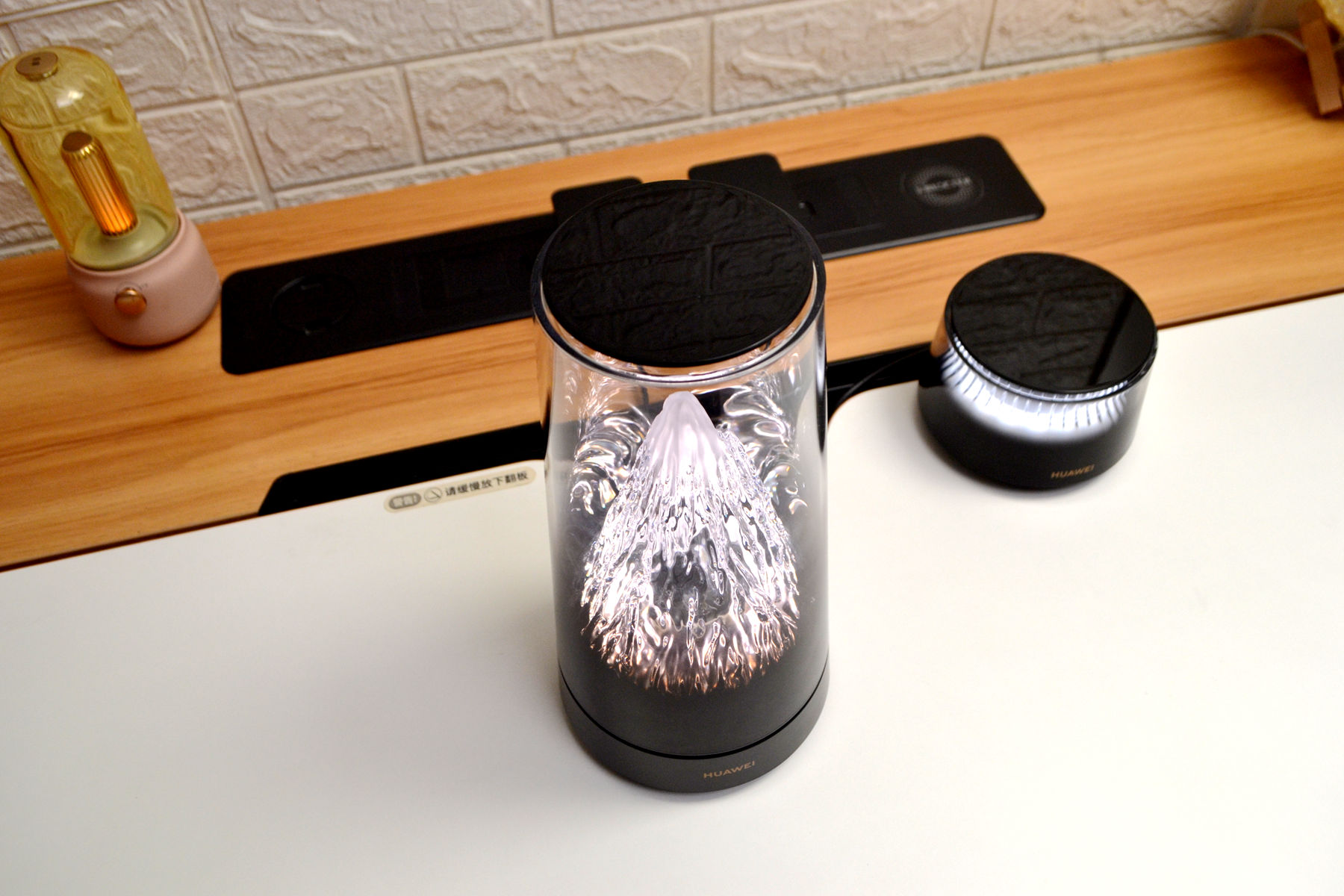 外观方面,华为日照金山X3 Pro完全打破了我们对传统路由器的认知,做得是真的好看,看不到天线,母路由是个圆柱形机身的渐变透明外壳,里面藏着一座微缩雪山,山体据说是用了500多道复杂曲面,光线一透过来,山体的纹理和起伏感做的特别好,特别好看。路由器不管摆在客厅茶几还是书房的书桌,都好看。
