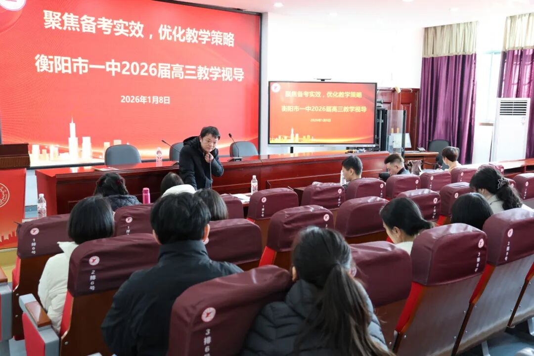 为全面了解高三年级教学现状与备考实施情况,诊断课堂教学效果,指导教师优化复习策略,1月8日上午,衡阳市教育局党组成员、副局长汪美玲率市教科院专家团队走进衡阳市一中对2026届高三开展教学视导活动。市教科院党支部书记邓斌、院长唐承衡、副院长成志高,市教学教研领军团队首席名师、核心成员,兄弟学校代表60余人参加此次活动。学校党委书记王小蒋、校长雷新生等陪同。