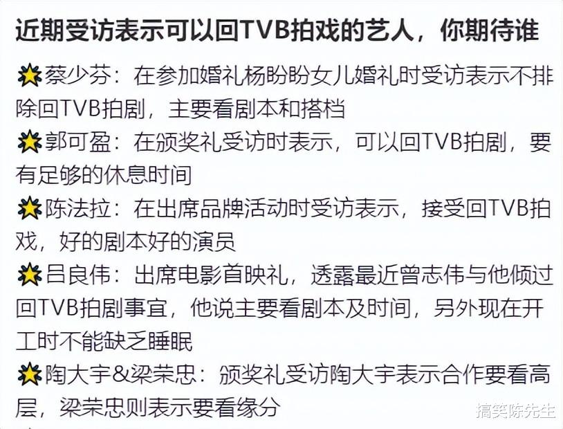 一些悉数出走的明星回归了,就能让TVB重回巅峰吗?这还很难说,就怕是昙花一现了,当今时代还是得看剧集的整体质量,以及TVB未来是否能有接班人。