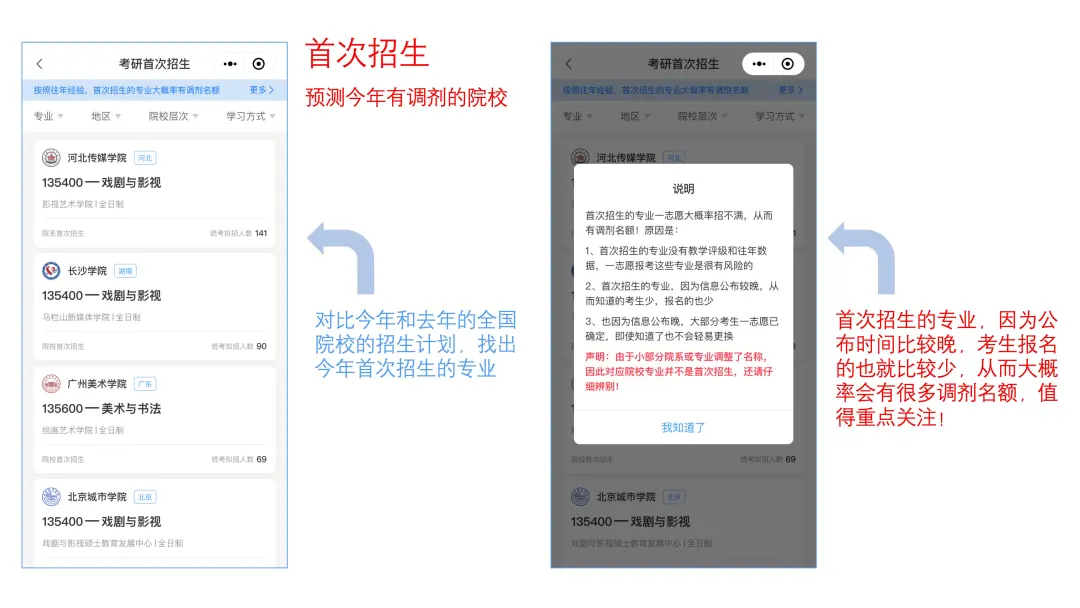 重点关注首次招生专业:因招生信息发布晚、报考人数少,往往留有大量调剂名额;