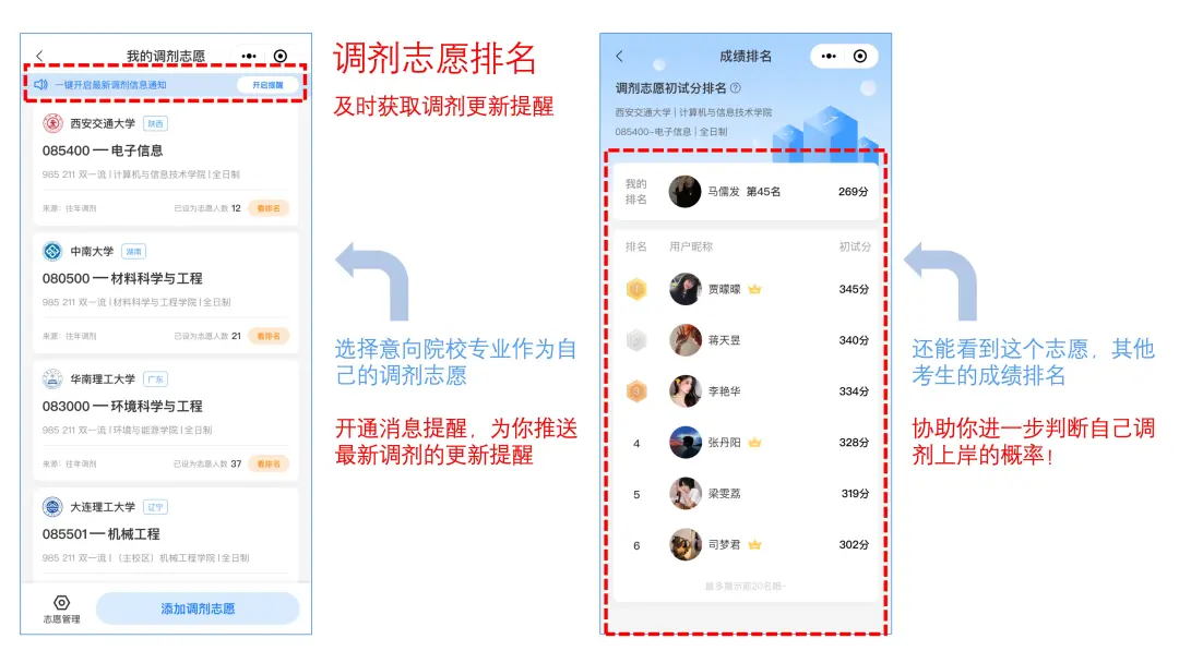还可查看同一调剂志愿下,其他考生的初试分数排名,掌握竞争态势,及时调整策略。