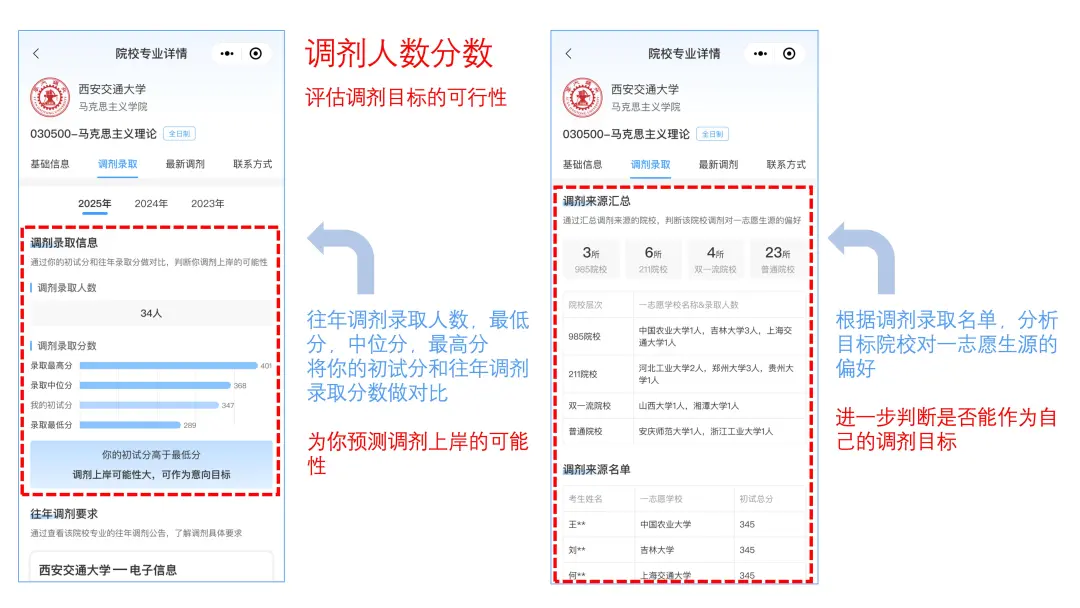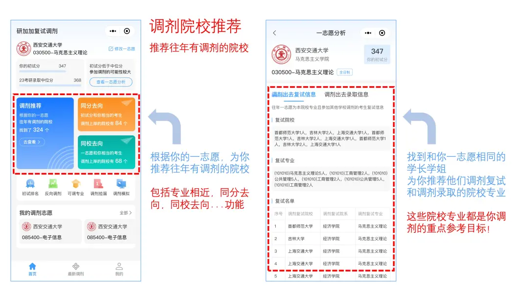 并且匹配“相近专业”的往届考生调剂去向,以及提供“同分去向”(与你分数相近的考生调剂去了哪)和“同校去向”(与你一志愿同校的学长学姐最终上岸院校)。