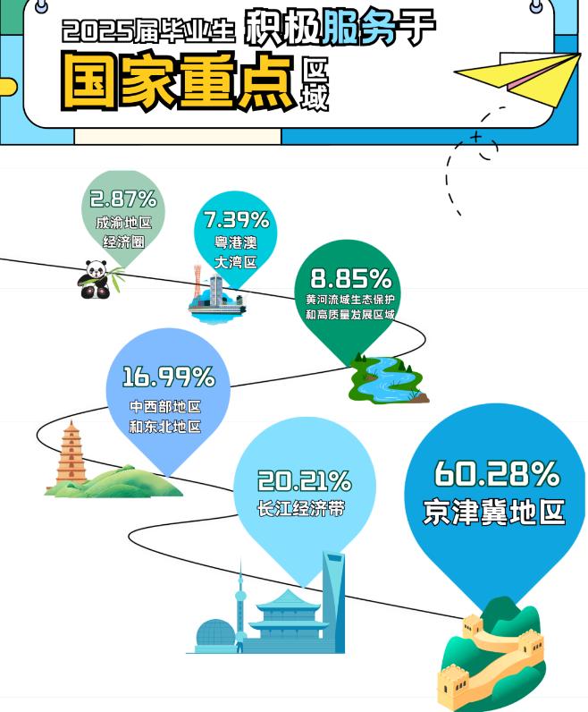 2025届毕业 生在国家重点区域就业分布:京津冀地区60.28%、长江经济带20.21%、中西部地区和东北地区16.99%、黄河流域生态保护和高质量发展区域8.85%、粤港澳大湾区7.39%、成渝地区经济圈2.87%。