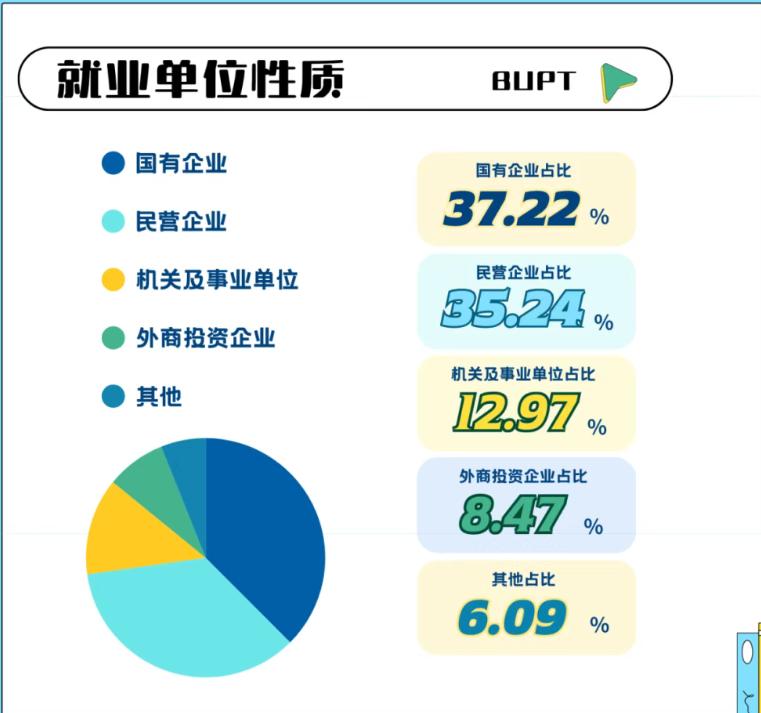 2025届毕业生主要就业单位性质:国有企业占比37.22%、民营企业35.24%、机关及事业单位12.97%、外资投资企业8.47%、其他5.09%。