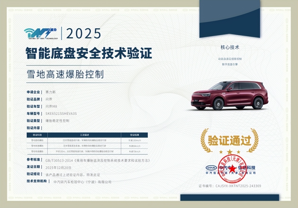近期,问界M8在2025中汽冬测中获得了“综合性能类验证”与“智能底盘安全技术验证”双证书,体现出其在低温环境下的整车性能与安全技术得到行业测试认可。