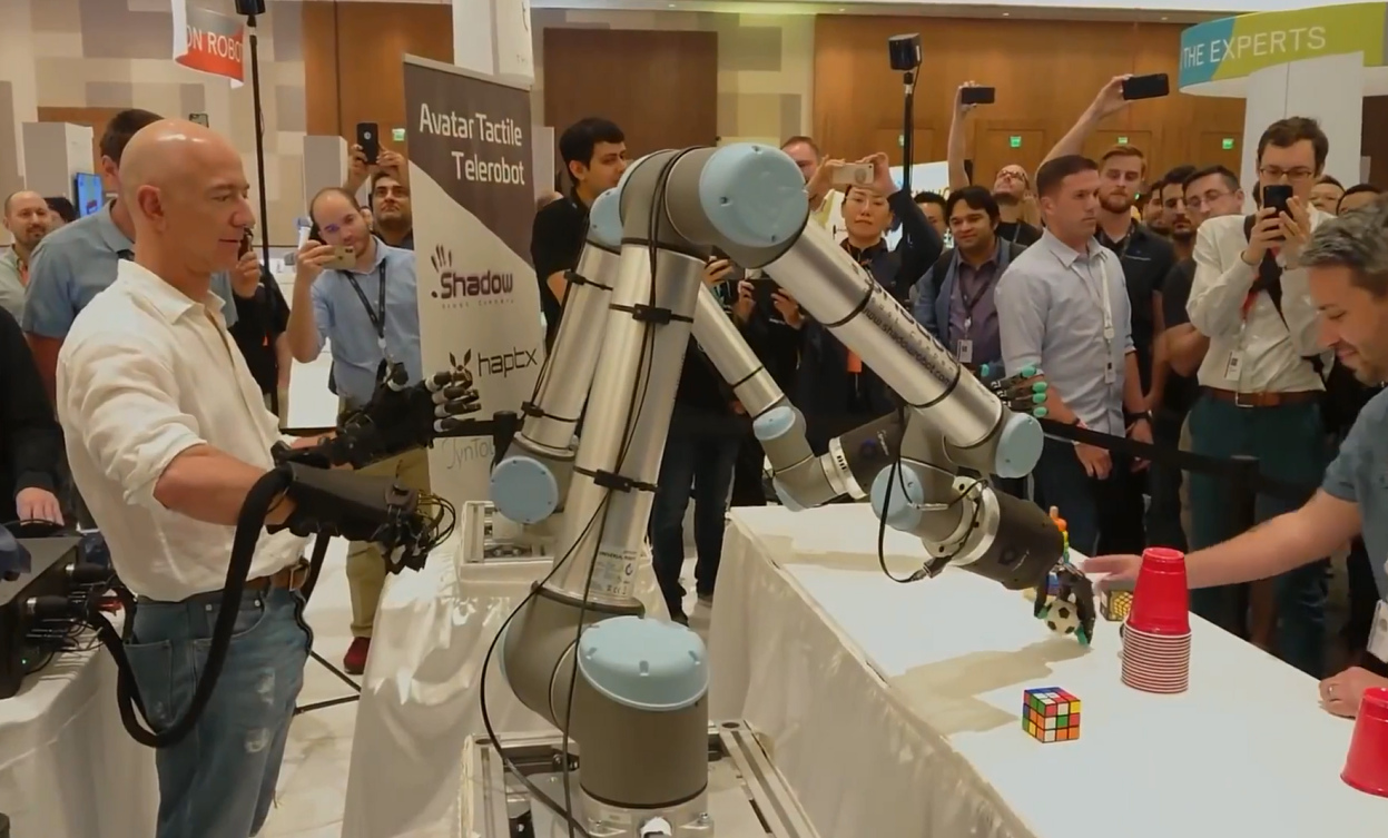 图1是前世界首富杰夫·贝索斯正在体验1台触觉遥控机器人,他的双手戴着指尖传感系统手套,前面的机械手臂跟随他的动作在操作,这乍一看没有啥,因为机械臂的发明可以追溯到1954年,70年来并没有本质上的变化。但是这款机器人却运用了远程触觉技术,机械臂可以把真实的触摸反馈到控制者的手指上。这样的好处不言而喻,比如在排雷时就能远程控制机械臂感觉到爆炸物的手感、温度和线路的松紧度。