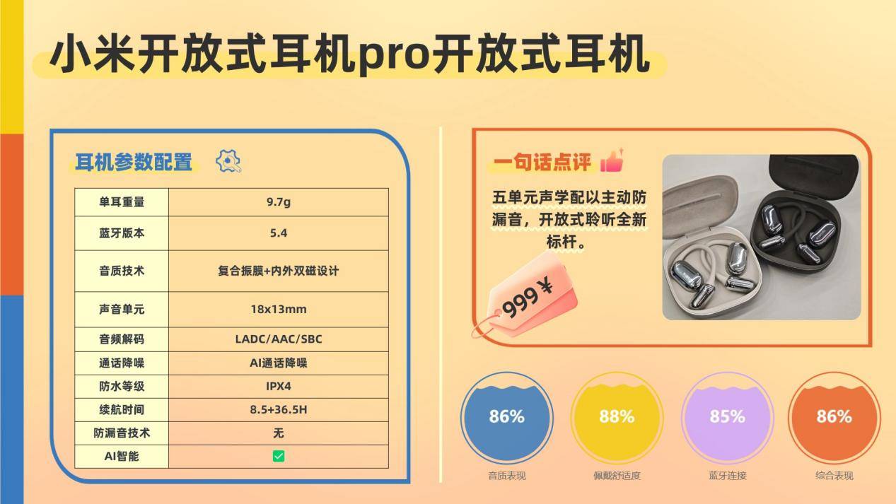 作为小米声学系列中的高端产品,小米开放式耳机Pro以高性价比为突出优势,并在硬件配置上实现显著升级。其创新的五单元声学结构尤为引人注目,将18×13毫米定制大动圈、双动铁单元及压电陶瓷高音模块高效整合。
