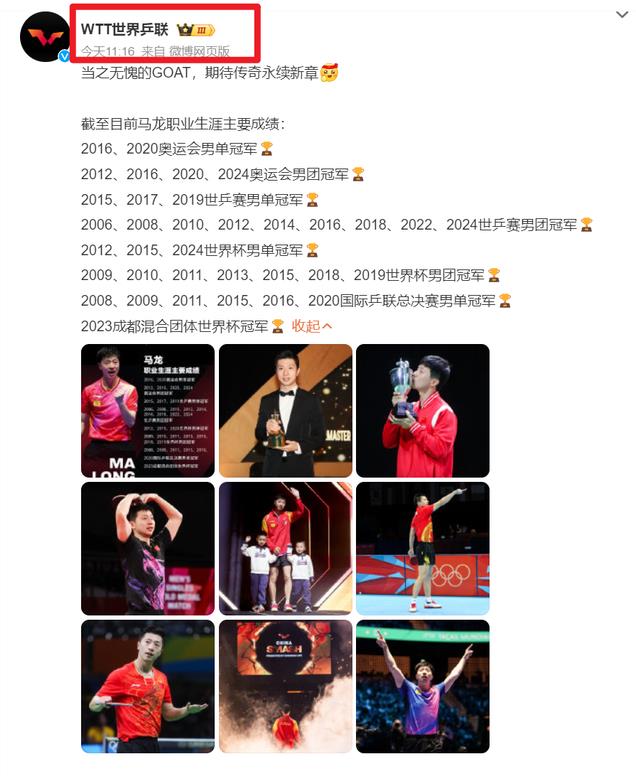 WTT在其中、英社交媒体上都更新有关马龙的部分。中文更直接,细数了马龙在其乒乓球职业生涯中获得的荣誉:6枚奥运金牌,世乒赛3次男单冠军和9次男团冠军等等诸多冠军,尤其是给出的评价“当之无愧的GOAT”,是相当高的。