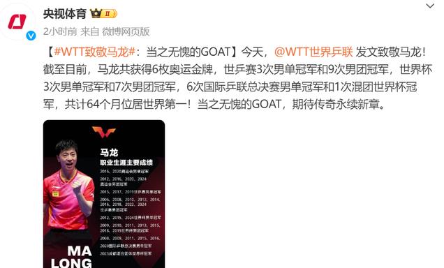 今天,WTT在其官方社交媒体突然发声盛赞马龙,给出了非常高的评价“当之无愧的GOAT,期待传奇永续新章”。