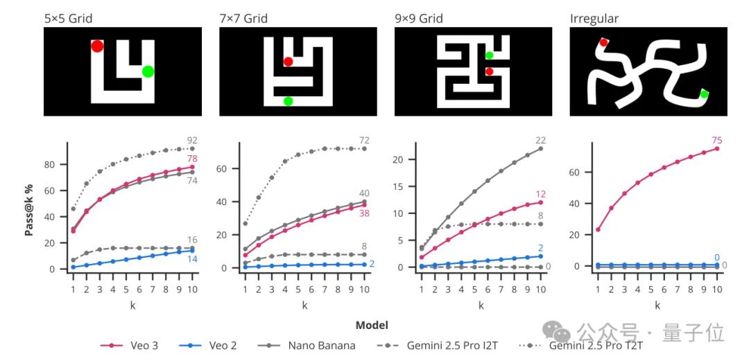 Veo 3能生成红点一步步规划路径的视频,不碰黑墙。5×5迷宫玩了10次,Veo 3成功率78%,Veo 2才14%。