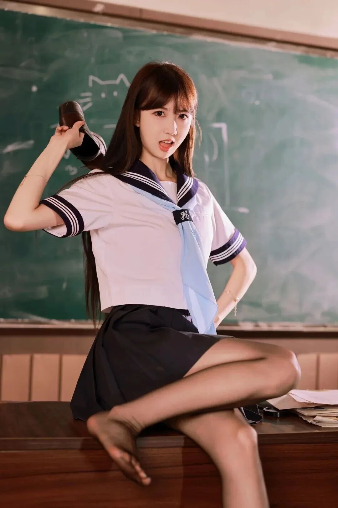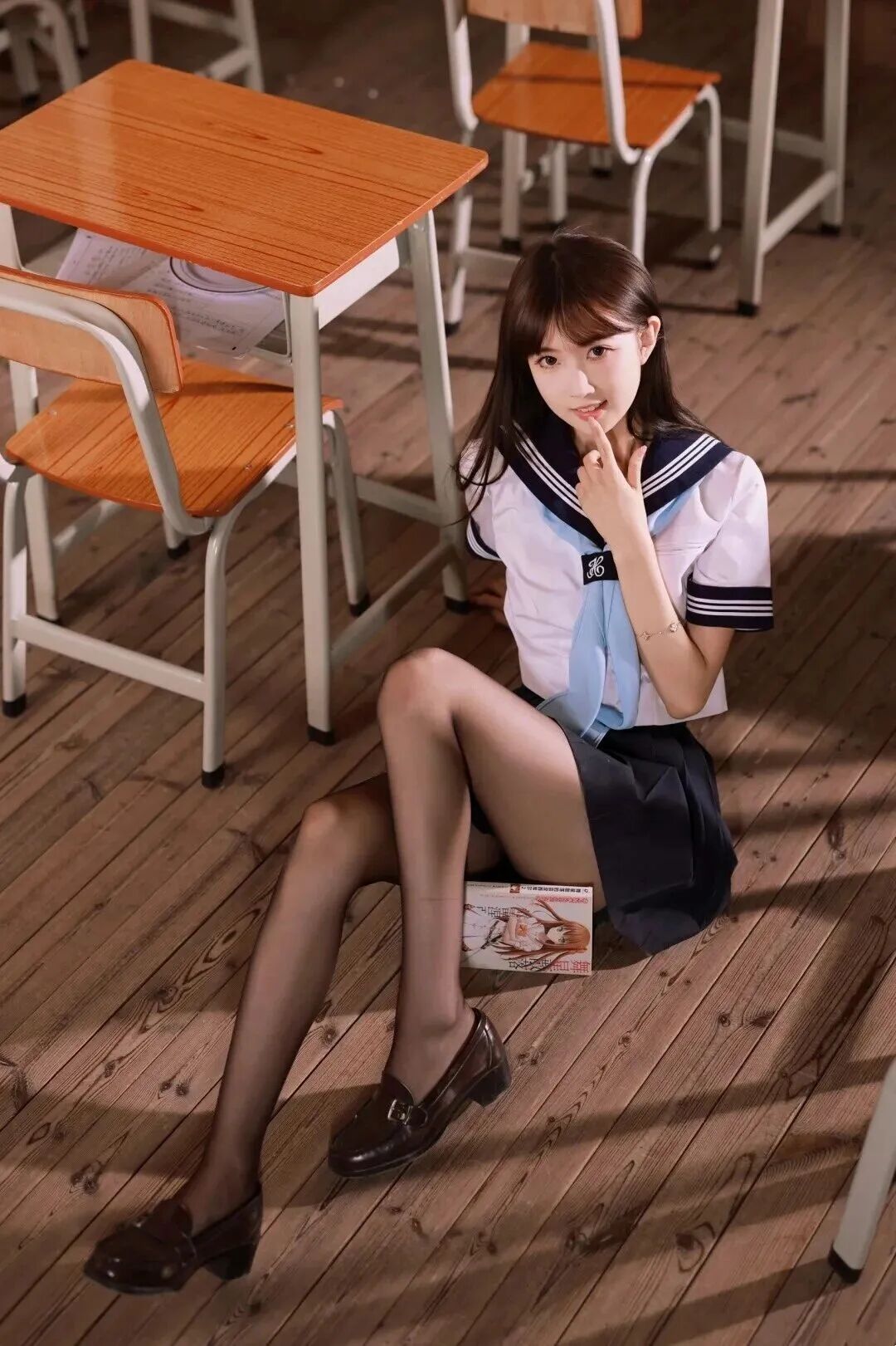 自信坐于课桌中央,翘起的二郎腿因绷直的脚尖更显腿长,双手或撑桌或自然放置,甜美制服与飒爽姿势碰撞出独特魅力。