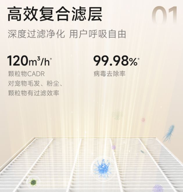 该产品采用H12级高效滤网,颗粒物CADR值达到120m³/h,对宠物毛发、粉尘等污染的过滤效率达99.5%。在加湿性能方面,配备800m³/h的大加湿量,配合6L大容量水箱,能够实现全屋快速加湿,解决了传统加湿器加湿速率小、难以带动全屋的问题。