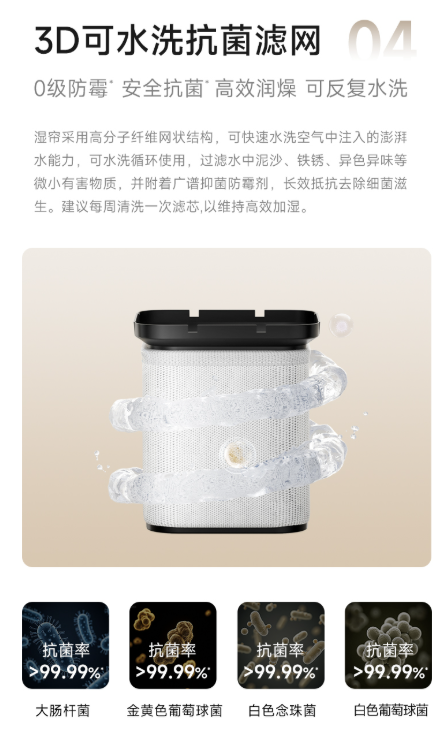 在产品维护方面,H40采用了3D可水洗抗菌滤网,用户可自行清洗后重复使用。湿帘支持水洗保养,配合设备的风干模式,有效解决了传统不可水洗湿帘容易产生霉味、需要频繁更换耗材的问题。