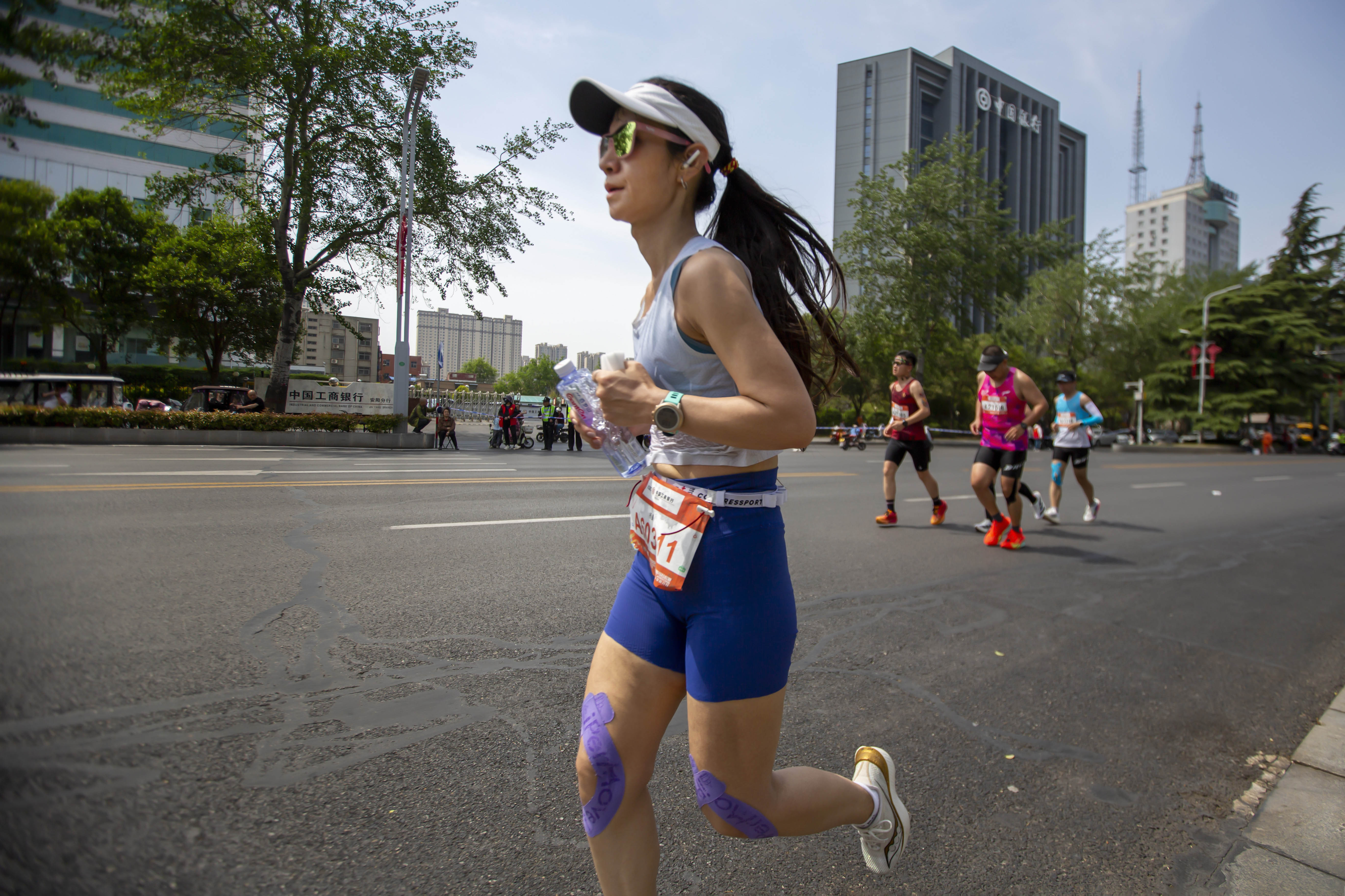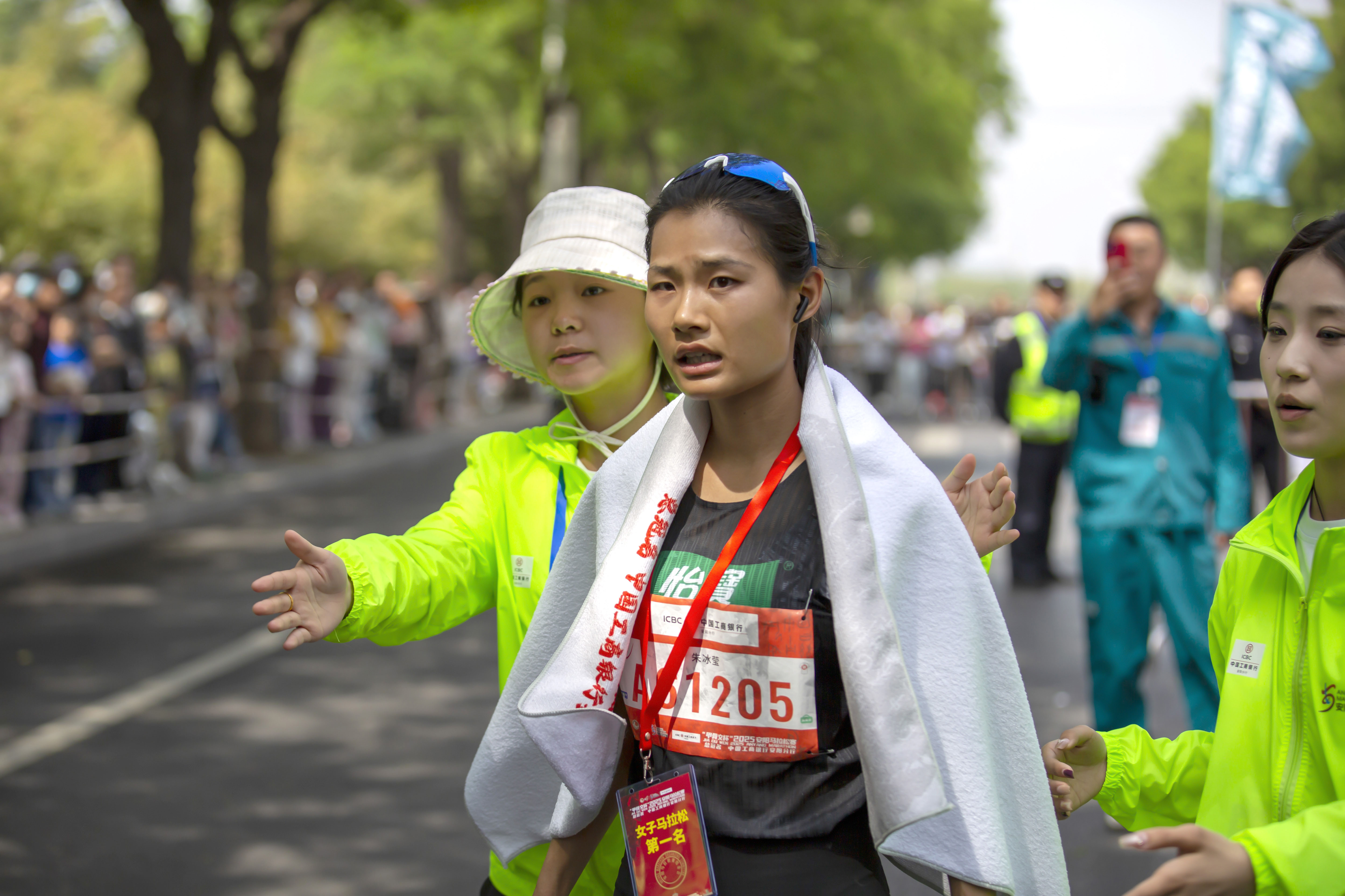 在完赛点,这位名叫朱冰莹的参赛选手以2小时48分27秒的成绩获得本届“安马”女子全程组冠军。