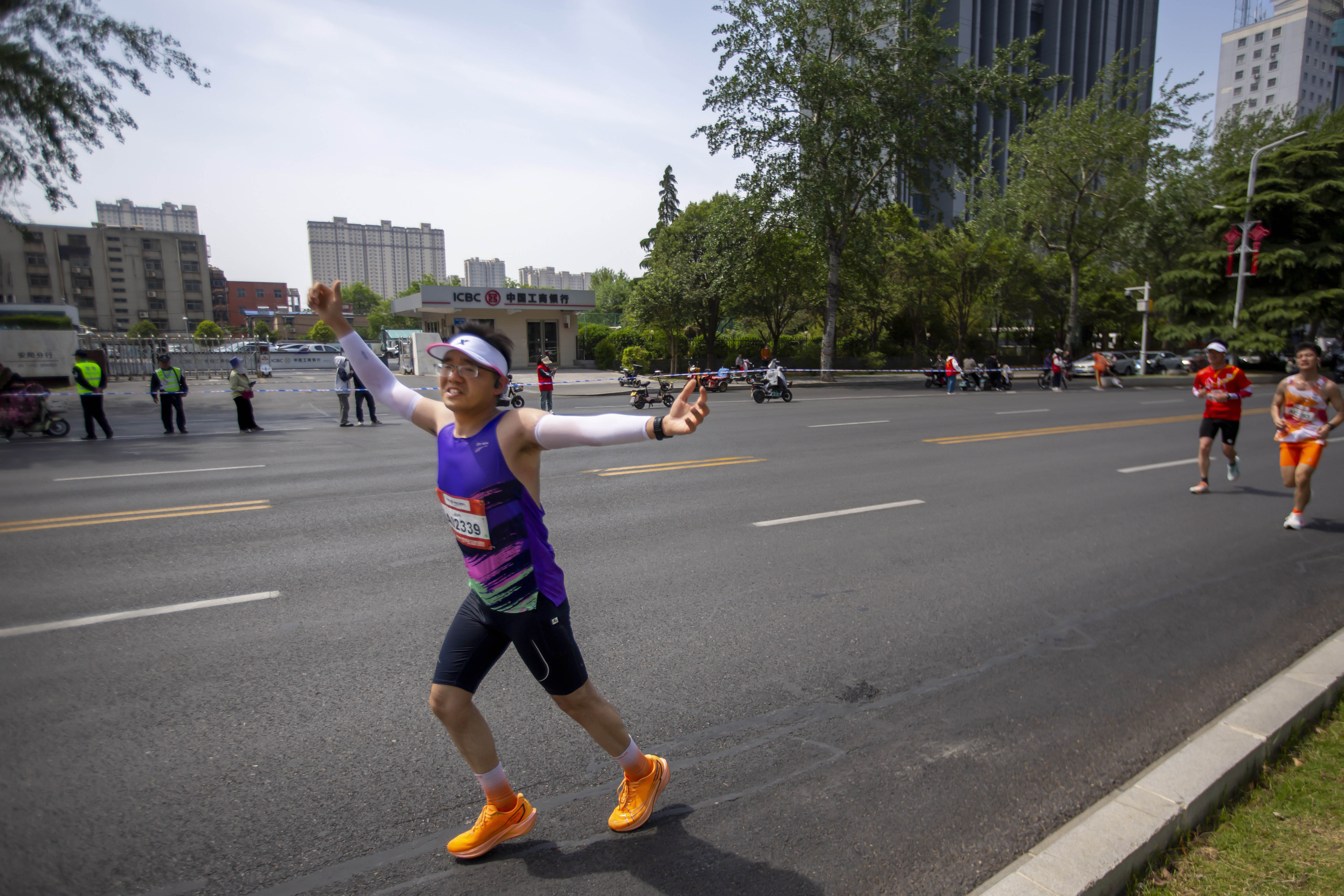 在安阳市北关区“玩赛”点,图为参赛选手范士庆以2小时22分45秒的时间第一个到达终点门,斩获本届“安马”男子全程组冠军。