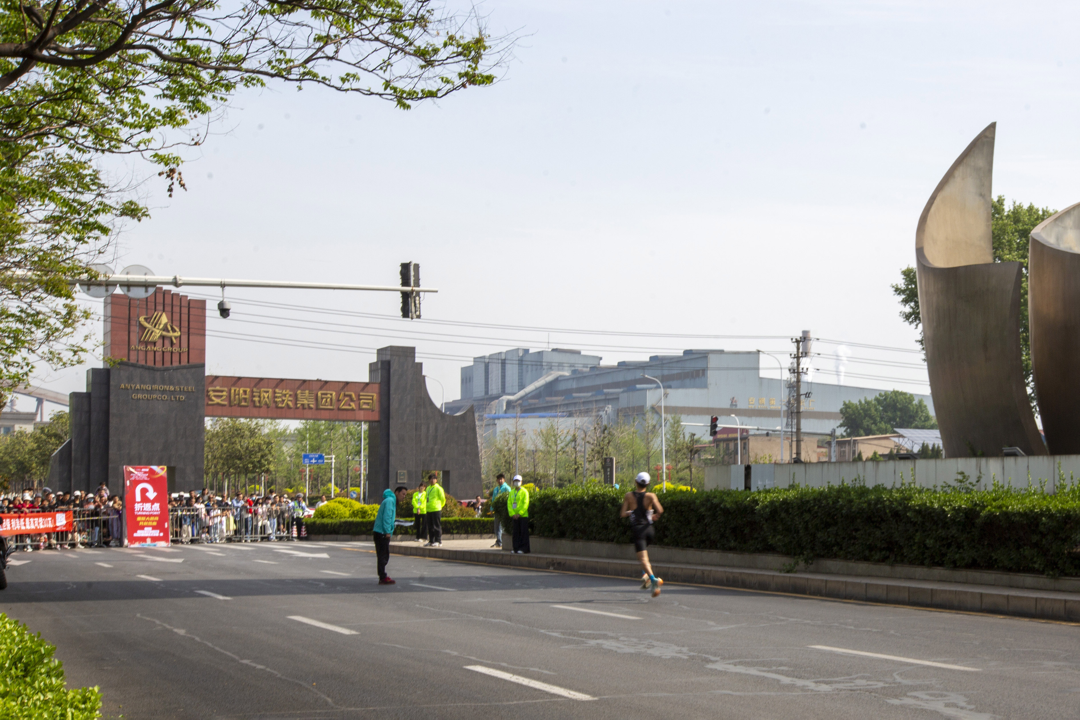 在安阳市殷都区安钢大道与钢花路的T型交汇处,参赛选手正在快速通过安钢(安阳钢铁集团公司)T型路口折返,继续奔向全程马拉松赛道。