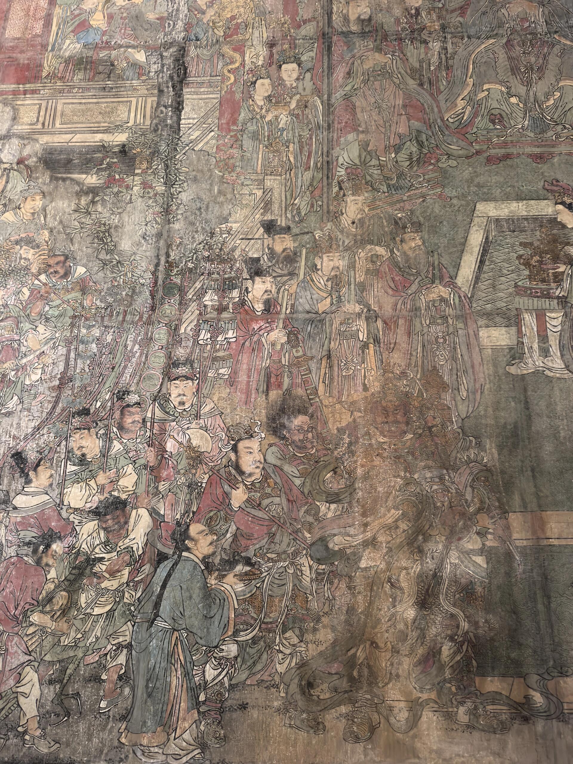 除了《捕蝗图》,其他壁画同样精彩。东壁上描绘着大禹、后稷、伯益三位传说中的先贤,他们或手持农具,或眺望远方,身旁簇拥着侍从,展现出古代先民对农业守护神的崇敬。西壁则是祭祀场面,身着华服的男女在庙宇前虔诚行礼,供桌上摆放着猪头、瓜果等祭品,香烟袅袅升腾,营造出庄重肃穆的氛围。整座大殿的壁画以红、绿、黄为主色调,虽历经岁月侵蚀,部分色彩已经黯淡,但依然能感受到当年绘制时的浓烈与鲜活。