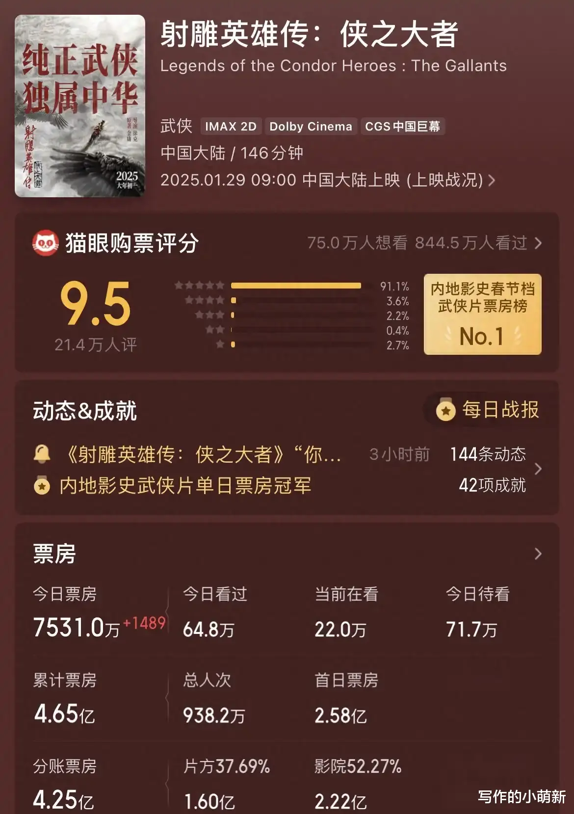 而这种市场潜力,也体现在徐克版《射雕英雄传之侠之大者》上。到大年初三,这部影片累计票房已达4.65亿。