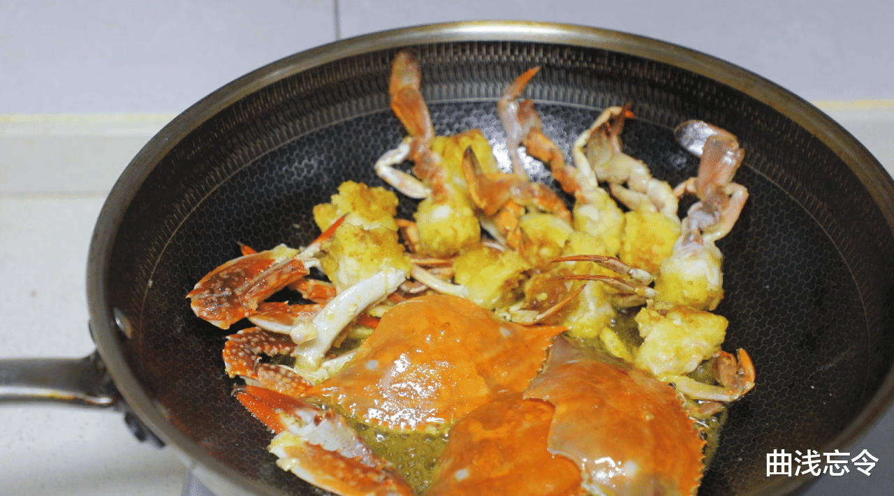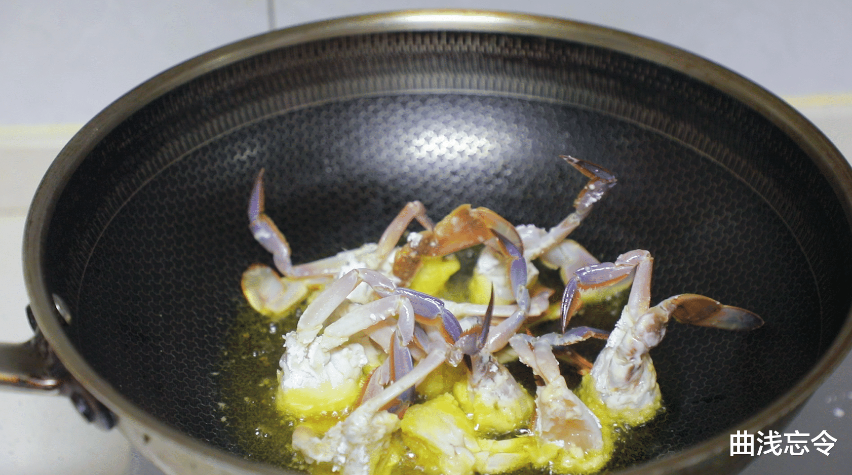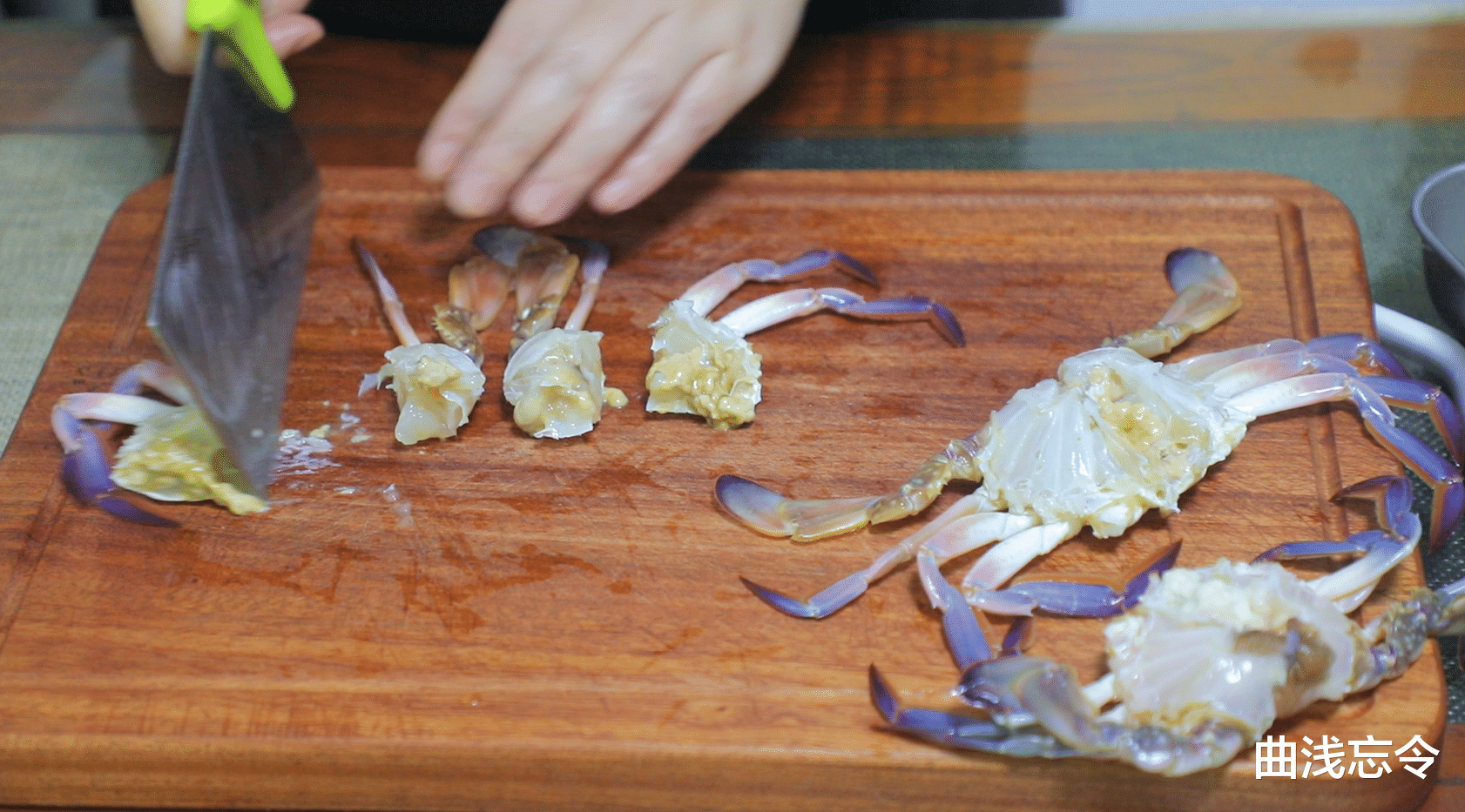 3、食材预处理(蟹):③蟹去掉蟹肠、蟹胃、蟹腮、蟹嘴、蟹心,清洗干净后,将蟹肉剁成4大块,蟹钳拍碎。蟹肉切面部分裹上土豆淀粉,蟹壳内和蟹钳上也撒上适量淀粉备用。