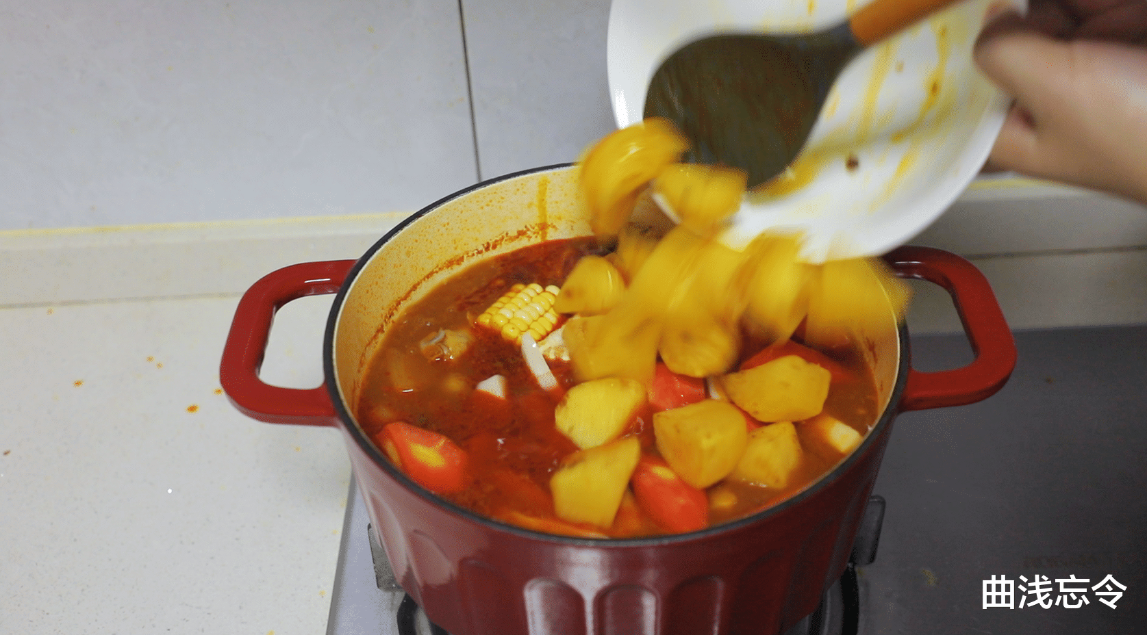 6.炖煮过程中注意火候和时间,每次加食材时也要翻动一下,避免粘底,不要煮糊了。